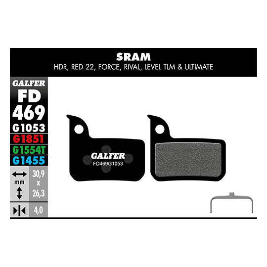 Las pastillas Galfer FD469 G1053 (código 8400170021690) están pensadas para ofrecer equilibrio entre potencia, control y bajo ruido en frenos de disco SRAM Road HRD y SRAM Level TLM/Ultimate (hasta 2018). Su compuesto G1053 Standard (semi-metálico) proporciona una frenada eficaz en condiciones variadas, con buena gestión térmica y desgaste contenido del rotor. Backplate de acero y formato sin aletas (Pad shape nº 37).