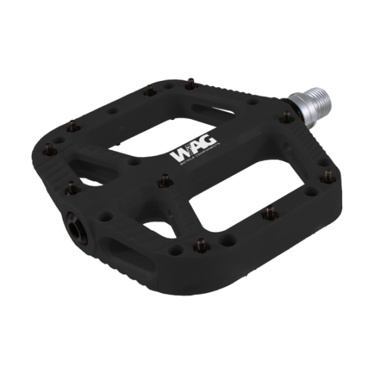 Las pedales WAG de plataforma en nylon están diseñados para ofrecer agarre, ligereza y resistencia en MTB y uso urbano. Su cuerpo de resina/nylon con eje Cr-Mo y 10 pines por lado garantiza apoyo estable y tracción incluso en terrenos bacheados. Medidas compactas para buen despeje y control.Â